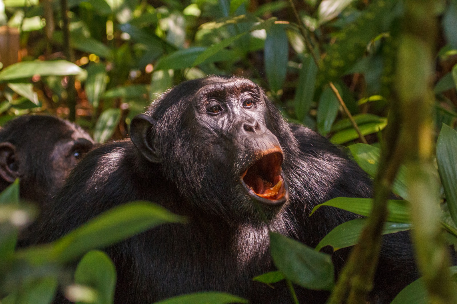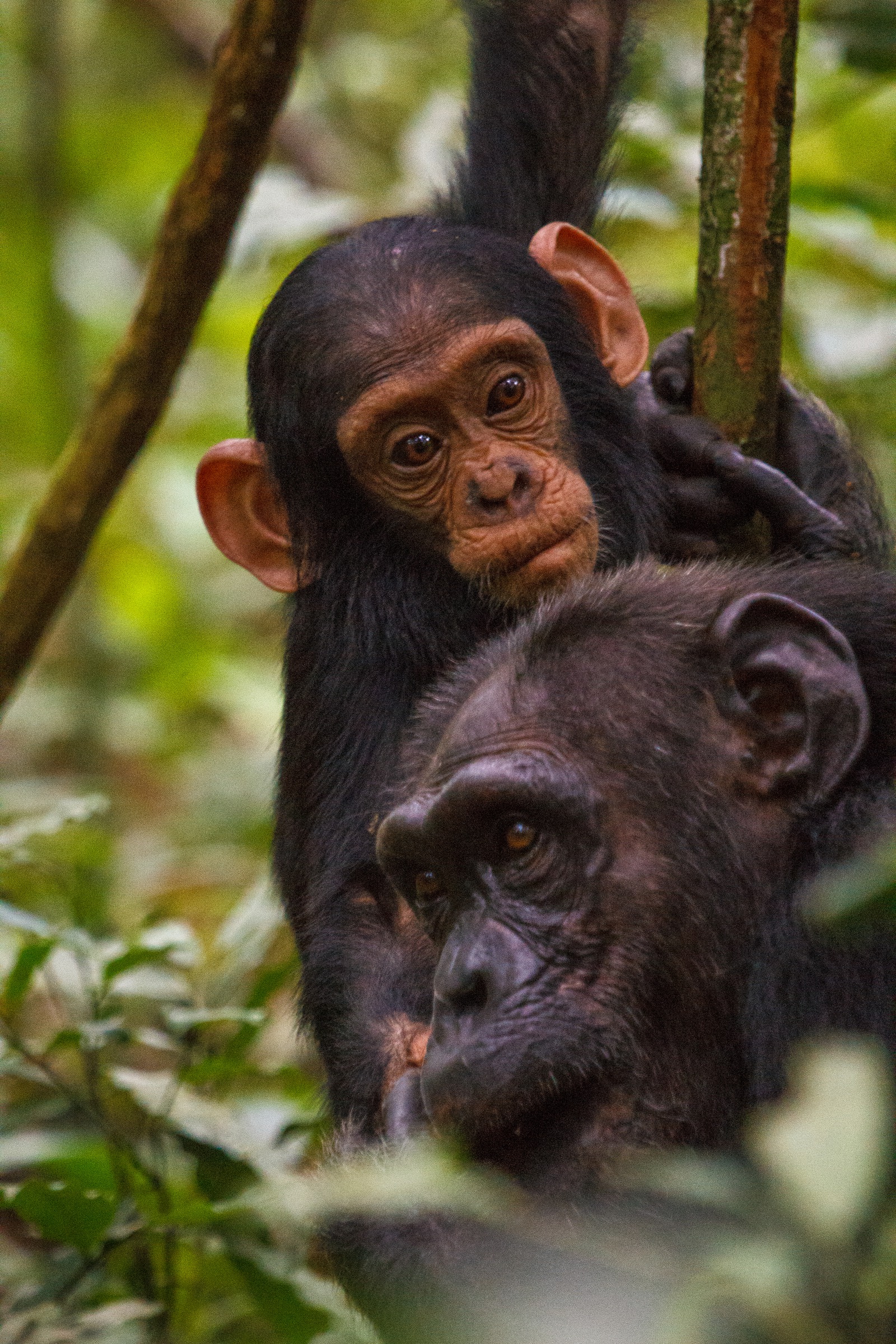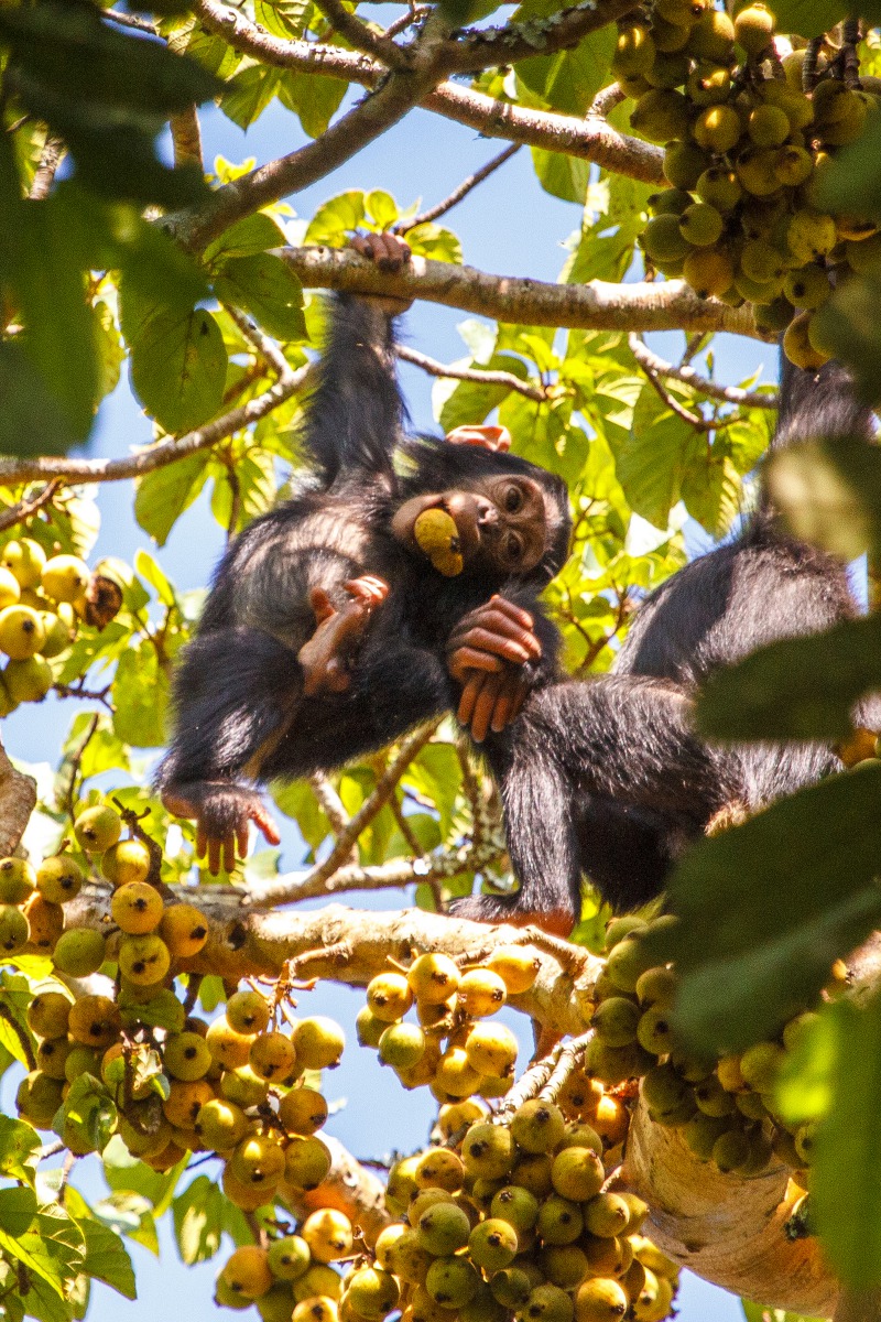 Chimp calls bring the forest alive. The three solitary animals join and are joined by countless more. It's suddenly very social: feeding time. I count over a dozen individuals moving about in the branches of the fig tree that towers overhead. They stuff their faces, flashing grins that reveal a mouthful of figs. A baby ventures away from his mother swinging from a limb. He's soon joined by another youngster, and they tumble about and start to play. Watching them swing at each other, legs kicking about, I'm taken back to my playground days on the monkey bars.