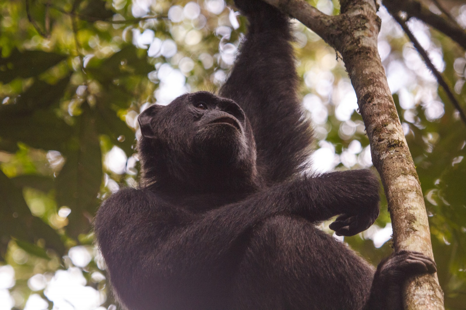 No sooner have we retreated into the forest when we cross paths with three male chimps on the move. They quickly scramble along the forest floor, and we start our pursuit of the leader. He will be our chimp for the day – we will follow shortly behind as long as we can keep up. Since chimps specialize in moving through the trees, it's surprising how adept they are on the ground. Fortunately for us lowly humans, they choose the path of least resistance. This allows us to just keep up, and only occasionally do we have to struggle through thick brush. The three chimps soon decide they have reached their destination. Here they reveal their true skill. In a matter of seconds they are 20 meters overhead in a tree. When one reclines on a branch, another carefully starts grooming him. High above in the forest canopy, he pores through the fur of his companion.