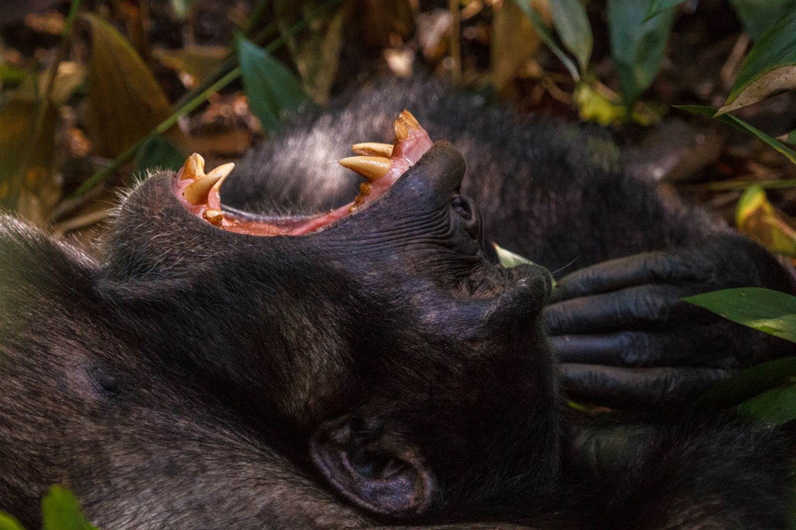 The feeding frenzy lasts for a long time. A large group of tourists shows up, unlike us they'll only get to see the animals for an hour. When they move on, we linger, take our time, and observe. The group of chimps starts to thin out as those that have had their fill move on. Our males hang back with a small group. Finding a shady part of the forest, they rest. Some individuals start grooming, while others let out yawns that reveal intimidating incisors. Our male finds some privacy and lounges back, laying on one arm. He pays us no attention when we approach and drifts off to sleep. We take the opportunity to snack and have a little rest ourselves. We've been in the forest for five hours already, but we're only getting started.